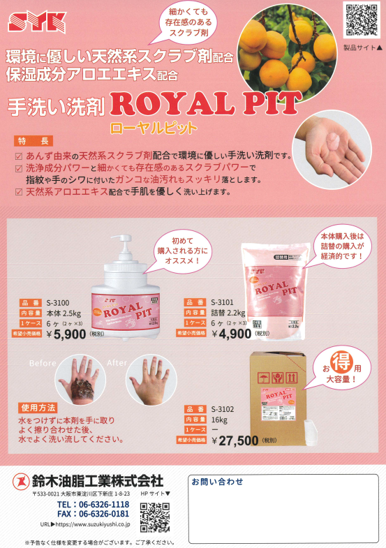 ホーム > 新着情報 > お知らせ > 鈴木油脂工業手洗い洗剤ローヤルピット