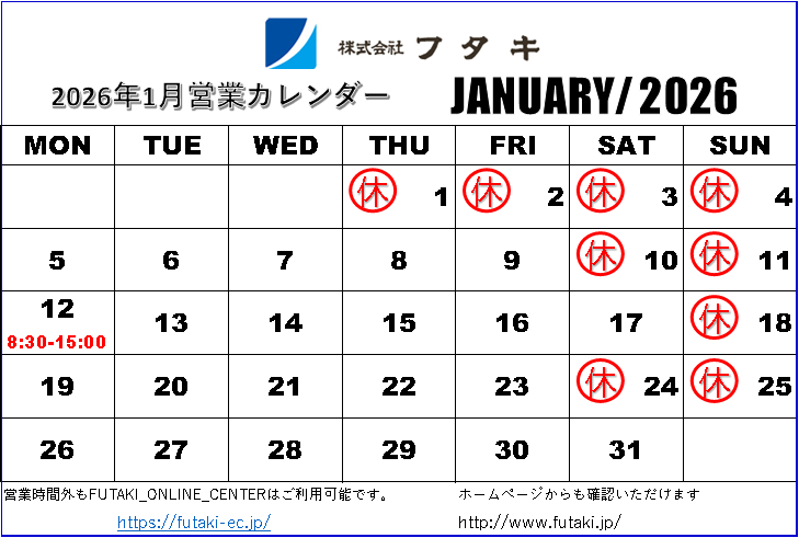 1月の営業カレンダー