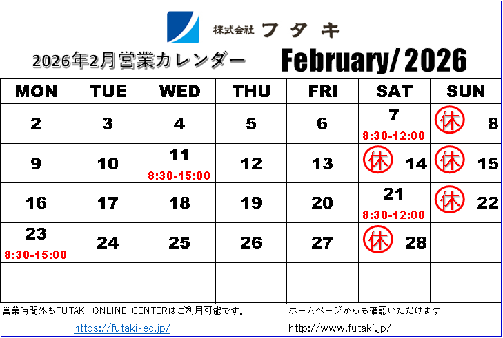 2月の営業カレンダー